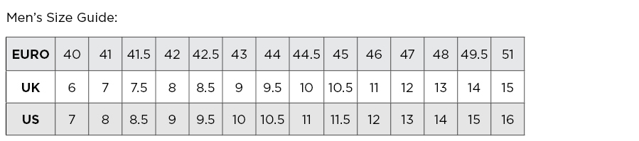 Our Men’s shoes are run in either UK sizing or EU sizing. We also offer two different widths in selected Men’s shoes.